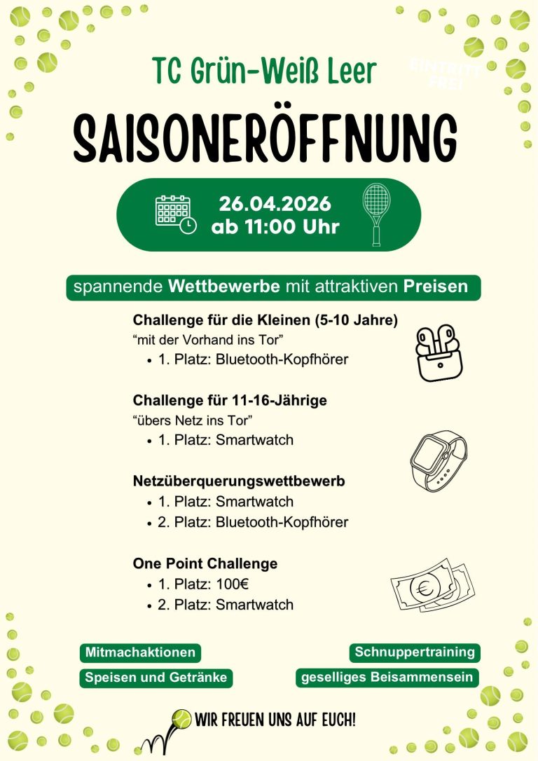 Mehr als 300 Mitglieder spielen auf unserer Anlage mit 9 Außenplätzen und 3 Hallenplätzen. Unsere grüne und zentral in Leer gelegene Tennisanlage bietet beste Bedingungen für Freizeitspieler, Mannschaften und Nachwuchstalente.
