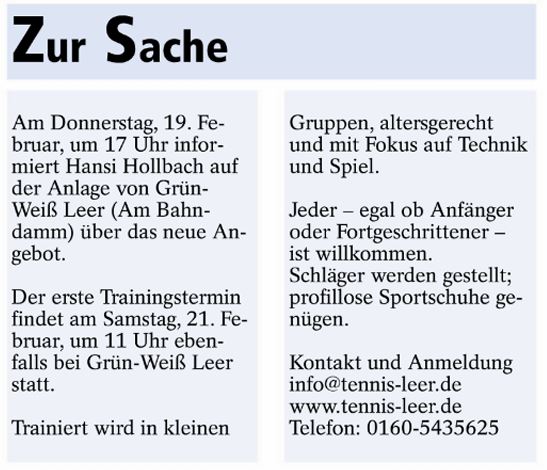 Es wird altersgerechtes Training in kleinen Gruppen geboten, in denen Technik und Spiel verbessert werden. Dabei darf natürlich der Spaß nicht fehlen - auf dem Platz und danach bei Kaffee, einem Kaltgetränk oder Snack auf unserer Terrasse. Für weitere Details klickt auf den Button Zeitungsartikel